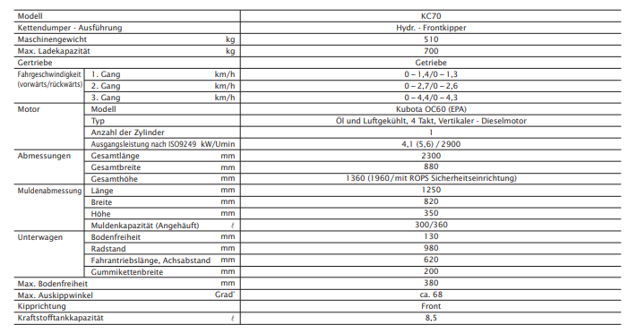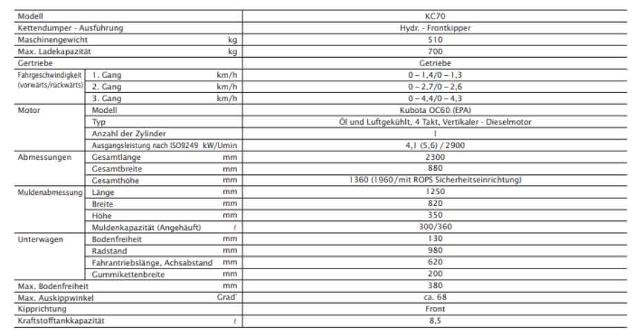 Seine kompakten Maße sorgen dafür, dass er fast überall einsetzbar ist. Seine geringe Arbeitsbreite von minimal 100cm lässt Ihn ohne Probleme an die engsten Stellen gelangen. Mit dem Kubota KC70 Kettendumper befördern Sie sicher und zuverlässig Erdaushub, Schotter und Mutterboder oder andere Werkstoffe an die gewünschte Stelle der Baustelle.